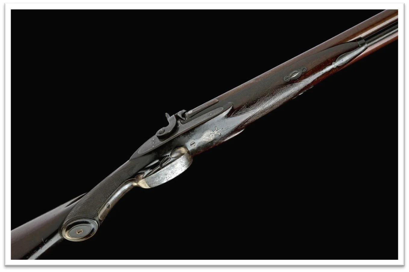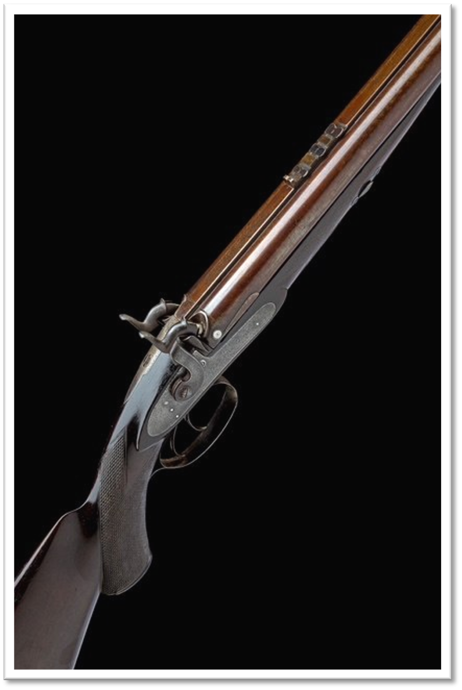 There is little information I found of W.F. Mills. He was listed at Brunswick Square in 1821 and High Holborn 1833-1837. The shop continued after his death in 1837 as W. Mills & Son 1837-1843. The barrels are stub twist Damascus with a length of twenty-six inches, sporting a standing sight with three additional flip-up sights, with vented platinum plugs on the breeches. Why the flip-up sights on any double rifle be it muzzleloading or breechloading have always puzzled me as any flip-up sights on a double rifle are nothing but fluff and eye candy as double rifles are short range firearms used in the woods or bush.
