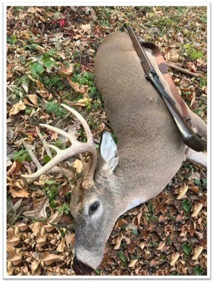 I returned to the woods at 3:00 p.m. later in the day. I didn’t have long to wait, and by 3:30 a small doe was loping towards me from further down the valley. All you hunters know the loping run a doe does when a buck is pushing her along. About 20 seconds more and here he came following. I always look at the body as I am just a meat hunter and yes, he was a good candidate. The doe passed on my right side the angled away. I whistled, I grunted and even made a pathetic bleat, but he heard none of it as his focus was on the doe. He started to pass on my right side, and I waited in hopes of him turning the same angle that the doe had. Sure enough he turned and it was a straight away shot, no matter if he was loping along or not himself.